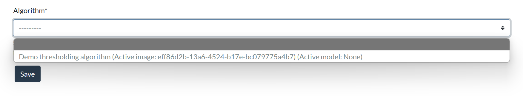 And in the dropdown under 'Algorithm' select your algorithm image and press Save.