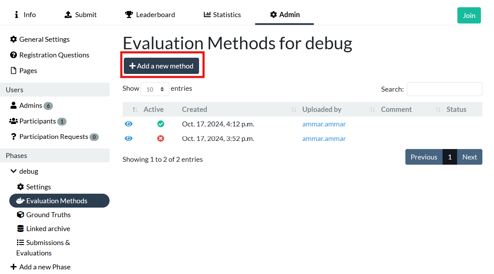 Then navigate to Admin → [name of phase] → Evaluation Methods. Press the button: Add a new method and upload the just generated .tar.gz.