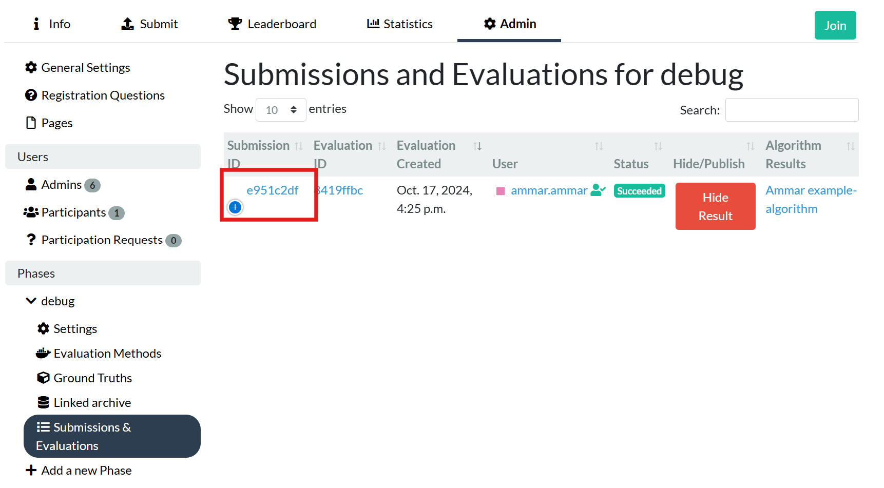 You might detect some problems. Investigate the logs and evaluation detail pages to identify the issue. Look for error messages or discrepancies. Is it the algorithm or the evaluation method that is failing? To see the logs of the evaluation, go to the Evaluation & Submission tab, click on the evaluation ID, and scroll down to the Admin section.