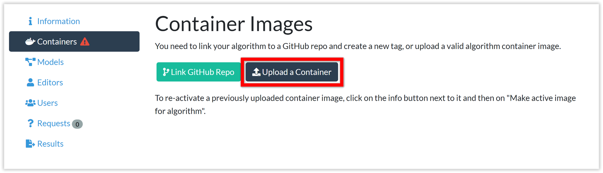 After you submit the above form, you will be redirected to your algorithm's page, specifically the container tab. Upload the Docker image that you exported locally by clicking on Upload a Container.