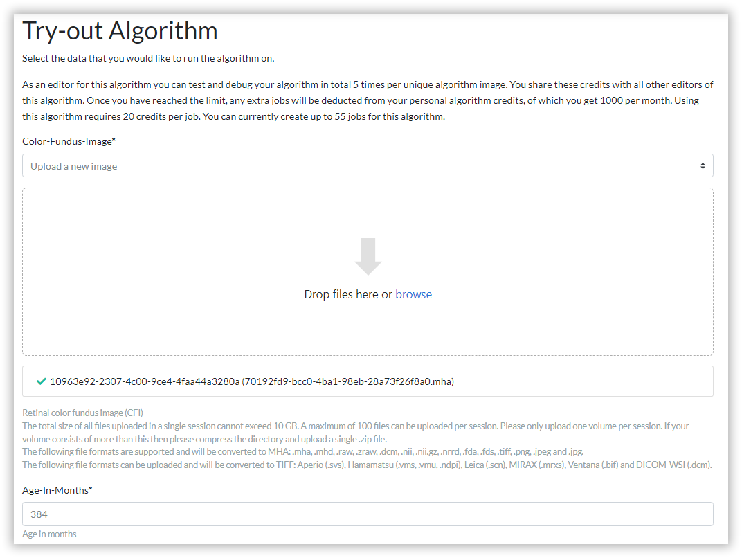 Once the image is active and ready to be used, you will see the Try-out algorithm tab in the sidebar. Use this to test the algorithm on one of the example images that we provided to you.
