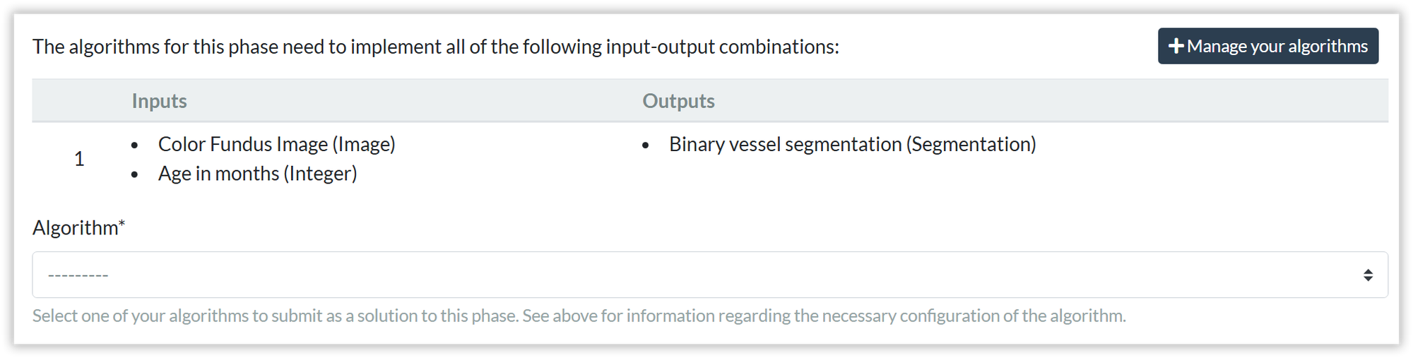 While the image is building (it should only take a minute), go to the Submit tab of your challenge. This is where you and your challenge participants will find a link to create an algorithm for the challenge. In this tutorial, we won't submit the algorithm to the challenge yet, but rather create and test the algorithm in isolation. So ignore the warnings at the top of the page (we will address these in hands-on #3) and scroll down and click on Manage your algorithmsto create an algorithm: