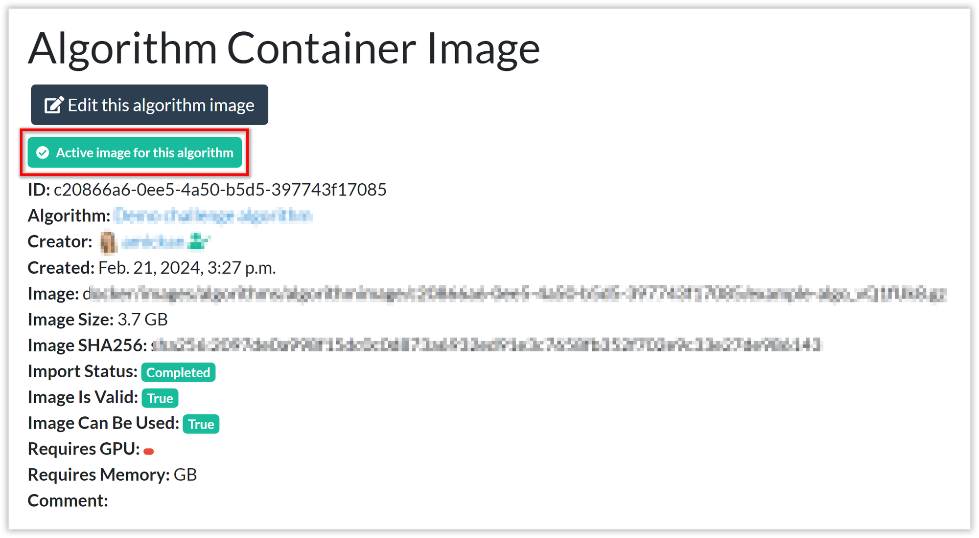 - Upload the updated image to your algorithm (see step 4). When you upload a new image, this image will automatically become the active image for your algorithm if it passes validation. So just upload the new image and wait for the import to complete. Verify that you see Active image for this algorithm before continuing.