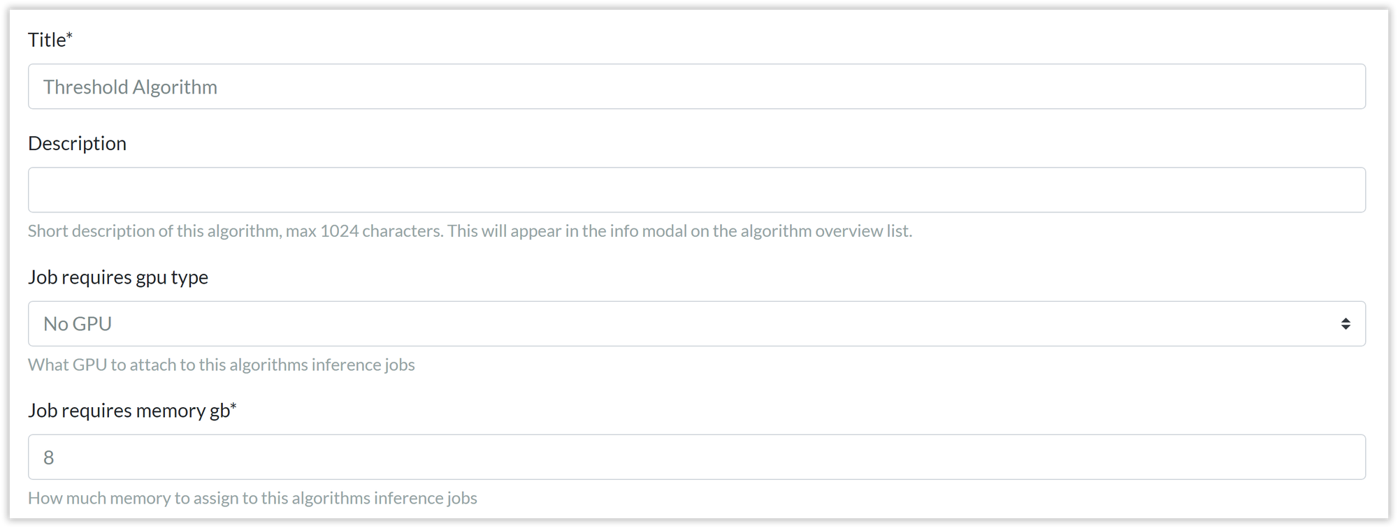 This will open a form that will ask you to give your algorithm a name and configure its resources. In this form, please stick to the defaults: no GPU and 8 GB of memory.